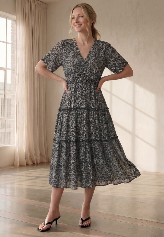 Make this dress your own with drawstring side ties that let you shape the empire waist to your best fit. Fashioned with flattering details: crisscross surplice neckline, ruffle-seam tiers, flowy crepe fabric you’ll just love.