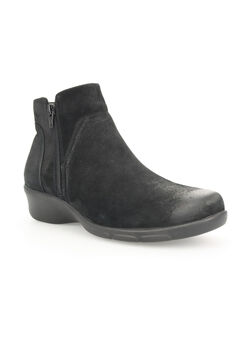 A suede-like black bootie with padded insoles and a low 3/4" heel for comfort.What customers like:Versatile color Well-made quality Stylish design Good ankle support Comfortable fit