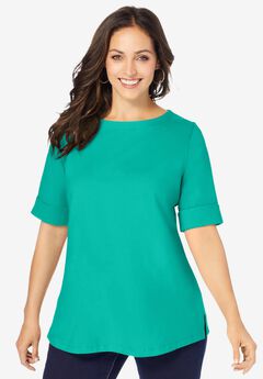 A pink cotton/spandex tee with a scoop neck and three-quarter sleeves for versatile styling.What customers like:Great fit Versatile style Flattering design Vibrant color options Comfortable fabric