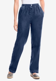 Look as good as you feel in our plus size straight leg jeans outfitted with stretch elastic waists and hidden tummy control panels. Our materials often have spandex incorporated so that you get the most comfortable fit that holds its shape all day. Plus, the cut of our straight leg jeans is universally flattering and will complement every body type.