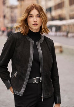 Woman Within has plus size leather jackets in essential colors including neutral black, brown, and white, as well as a variety of pretty hues to match your style. Peach, teal, blue, pewter, and berry are just a sampling of what’s available in our selection.