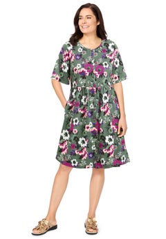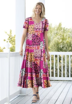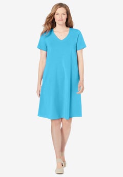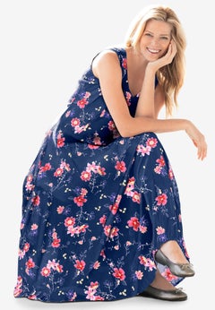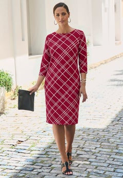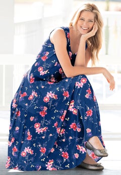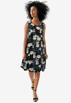 Our year-round collection of plus size dresses and skirts features pieces that can be worn in the spring, summer, fall, and winter months. Perfect for sightseeing during your tropical vacay, you'll love the breathability and easy style that our sundresses and knit skirts offer. We suggest taking along the scarf print dress by Ellos® featuring a hanky hem and trapeze silhouette. And when the temps start to drop, reach for our cable knit sweater dress, opaque tights, and a cute pair of knee-high boots from our shoe shop.