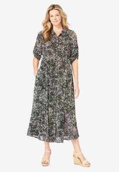 Our year-round collection of plus size dresses and skirts features pieces that can be worn in the spring, summer, fall, and winter months. Perfect for sightseeing during your tropical vacay, you'll love the breathability and easy style that our sundresses and knit skirts offer. We suggest taking along the scarf print dress by Ellos® featuring a hanky hem and trapeze silhouette. And when the temps start to drop, reach for our cable knit sweater dress, opaque tights, and a cute pair of knee-high boots from our shoe shop.