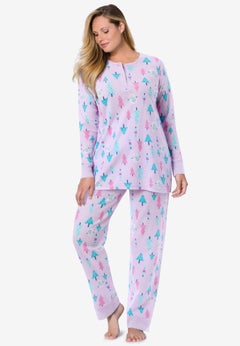 We suggest our Classic Flannel Pajama Set by Dreams and Co. Made from warm brushed flannel cotton, this adorable set comes in a variety of colors and prints. The timeless notch collar and picot trim add familiar flair, and we can't get enough of the flexible elastic waist design.