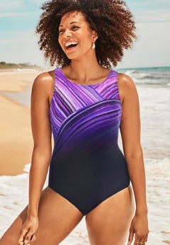 Our plus size one piece swimsuits have lots of slimming features that we think you’ll love. One of the most common slimming features we use is power-mesh lining for tummy control. Several of our suits also have built-in shelf bras for bust sculpting and support.
