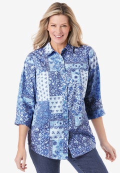 When a plain tee just won’t do, reach for a shirt or blouse instead. A year-round style essential, the right top instantly elevates any outfit. But finding a plus size shirt or blouse that fits flawlessly can be a challenge. Some are too long or too short, others too tight or boxy—and too many gape at the chest. At Woman Within, our plus size blouses and blouses are designed specifically for fuller figures so it’s easy to find a style that fits and flatters your curves. Featuring tons of pretty color and print options, our exclusive collection has something for everyone. Choose from short sleeves, long sleeves, three-quarter sleeves and tanks; breezy popovers, crisp button-downs, tailored blouses, easy tunics and more—all in sizes 12W to 44W.