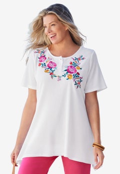 Our Classic Flannel Shirt has options for traditional ladies, as well as unique hues and prints that provide a welcome twist. In addition to red plaid, it’s available in a graphic floral and varying colored plaids. Try rosebud, deep turquoise, and purple multi for a fresh fall look.